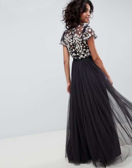 Needle Thread embroidered bodice tulle maxi dress in graphite Very well made.