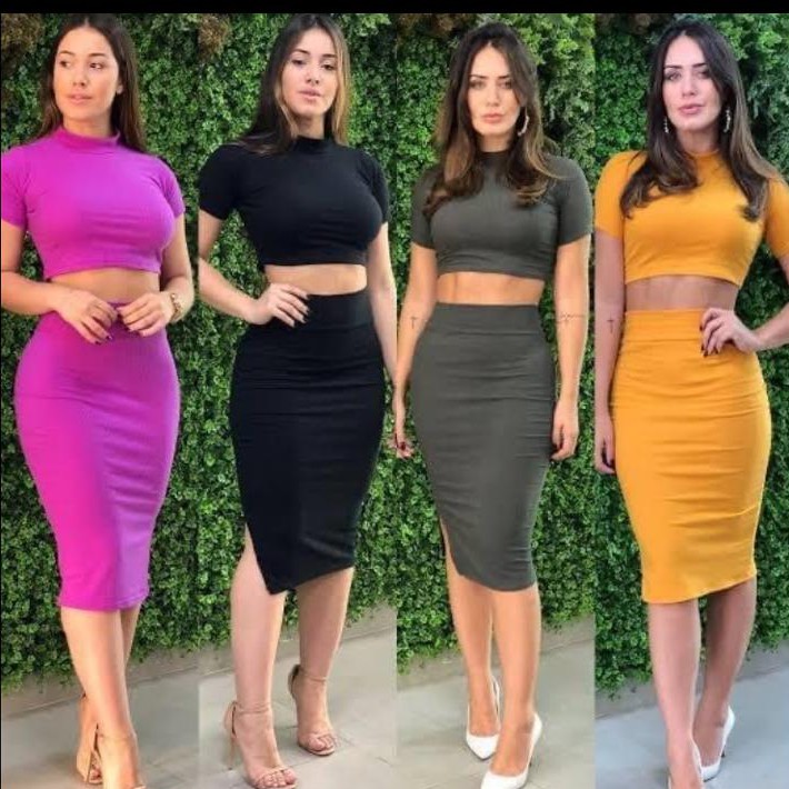 Conjunto Feminino Saia Midi E Cropped Social Moda Blogueira Malha Canelada P ao G Very well made.